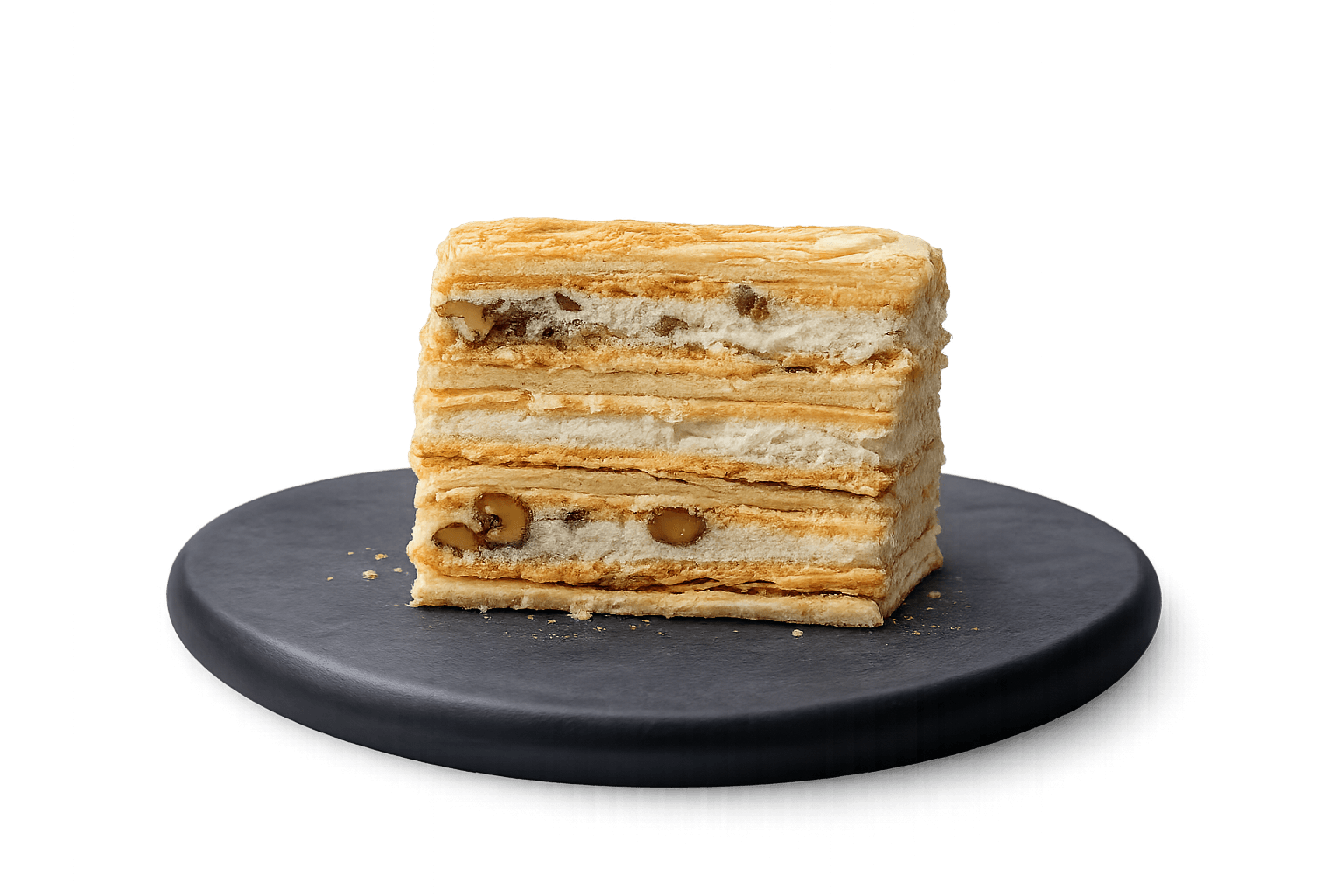 A delicate, multi-layered dessert featuring crisp, flaky puff pastry alternating with smooth, light-as-air vanilla pastry cream.